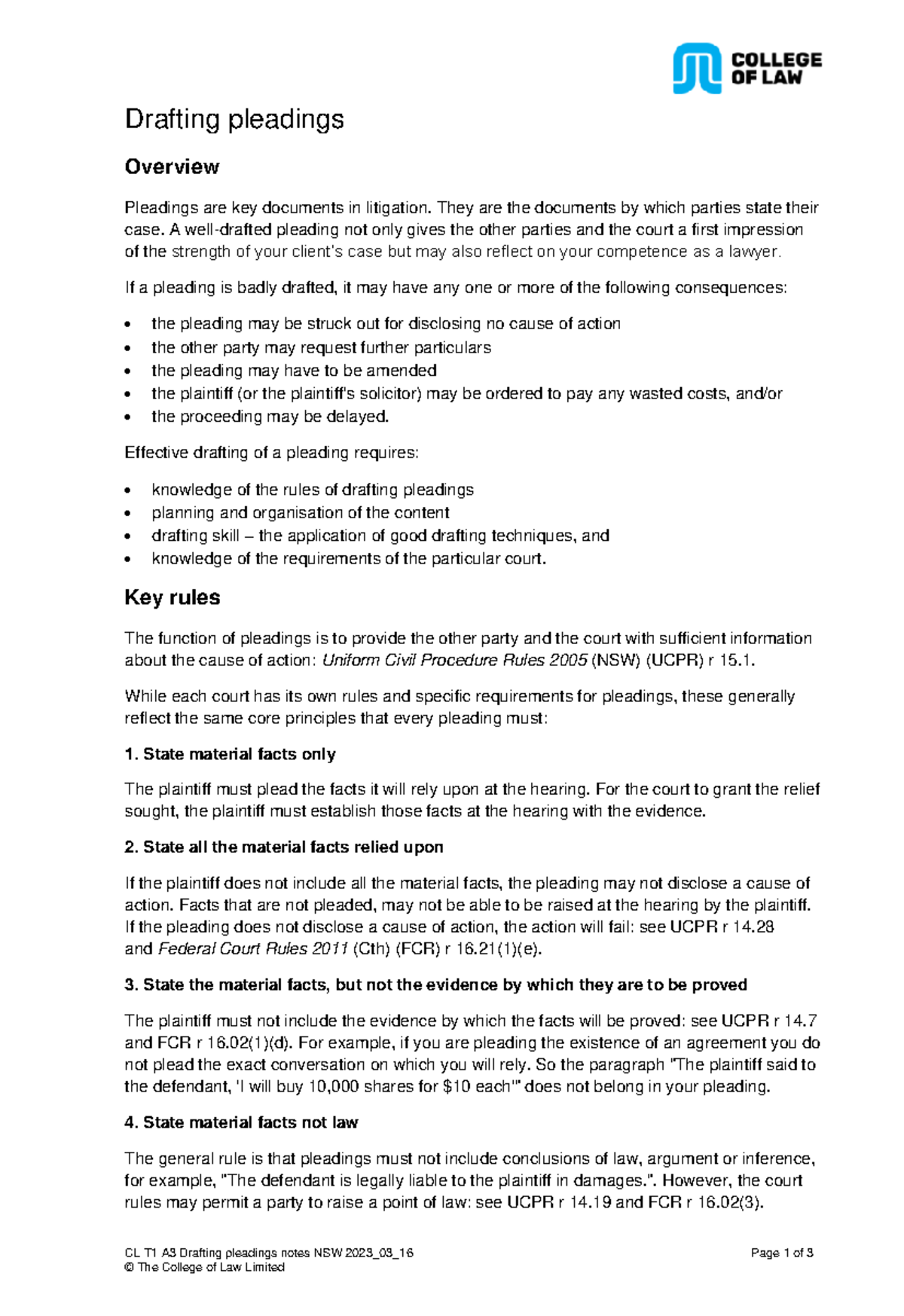 CL T1 A3 Drafting Pleadings - Comprehensive Notes on NSW Practices ...