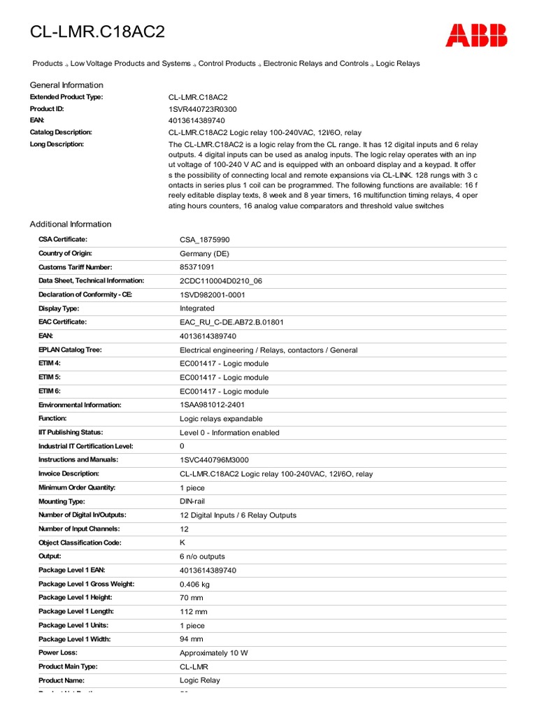1SVR440723R0300 CL LMR C18ac2 Logic Relay 100 240vac 12i 6o Relay | PDF ...