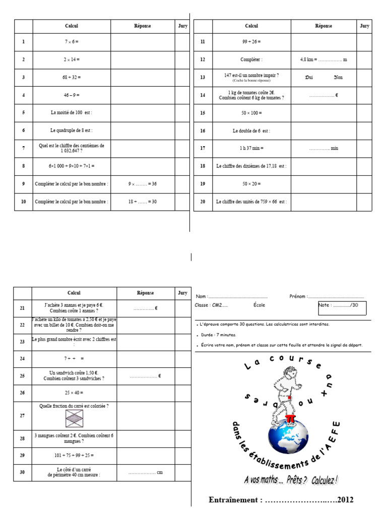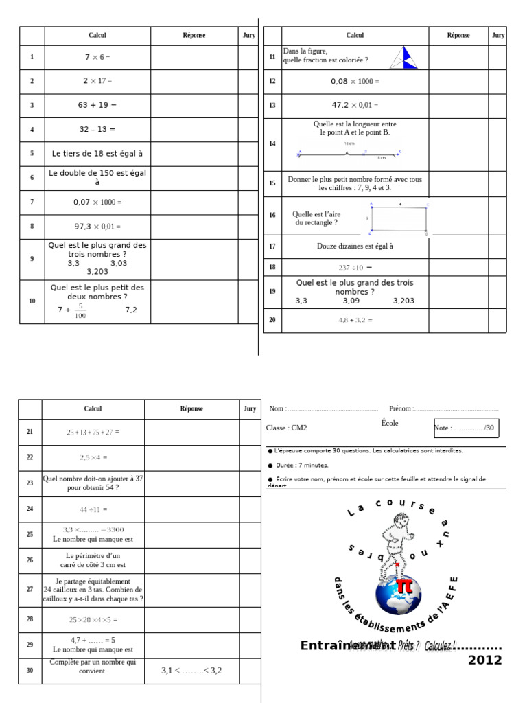 Sujets entrainement CM2 - Calcul / Connaissance des nombres Réponse ...