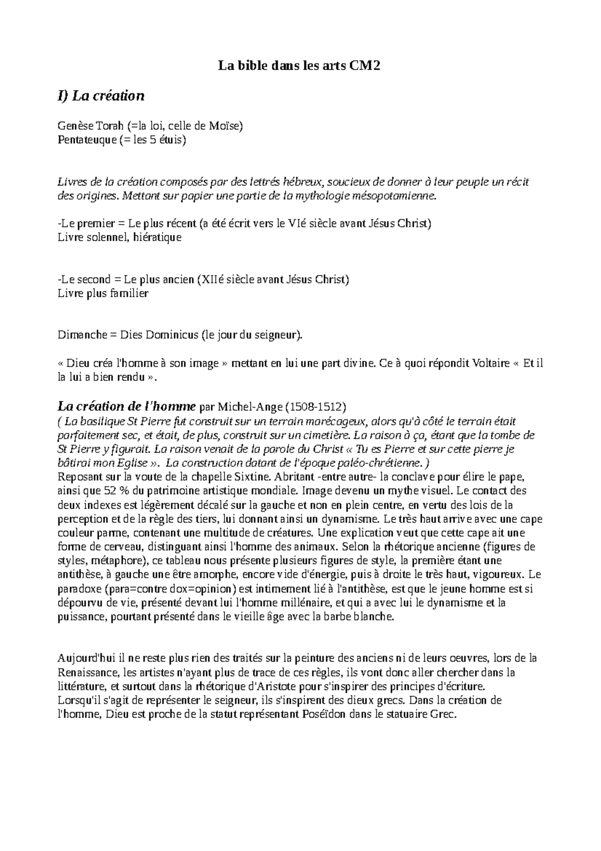 CM2 - Notes de cours 2 - La bible dans les arts CM2 I) La création ...