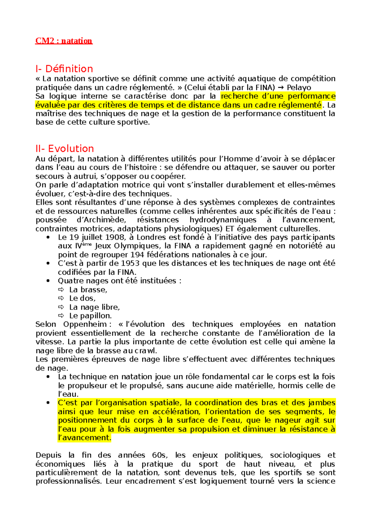 CM2: Notes sur la Natation Sportive et Son Évolution - Studocu