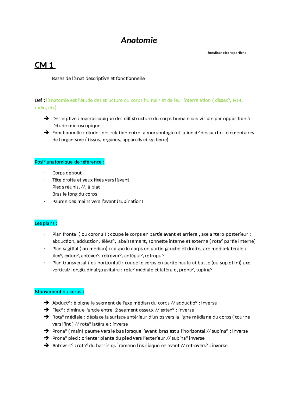 Notes de Cours d'Anatomie - CM1 et CM2 - 2023 - Studocu