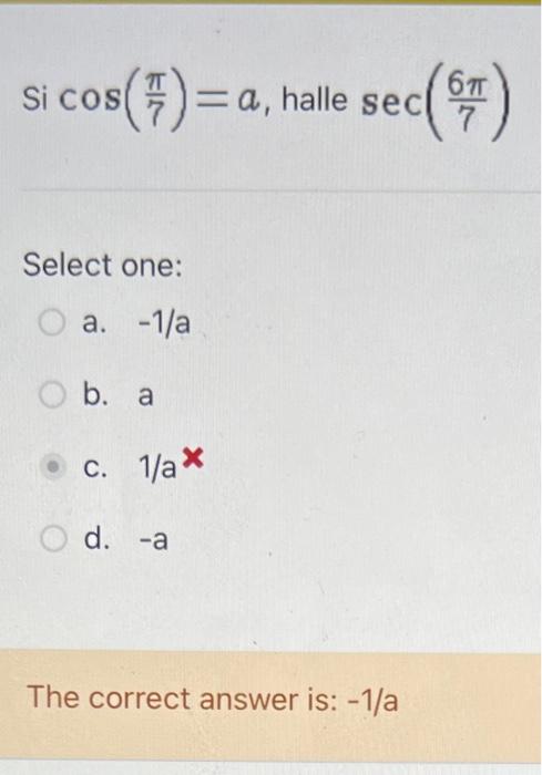 Solved Si cos(7π)=a, halle sec(76π)cos(7π)=aSi cos(7π)=a, | Chegg.com