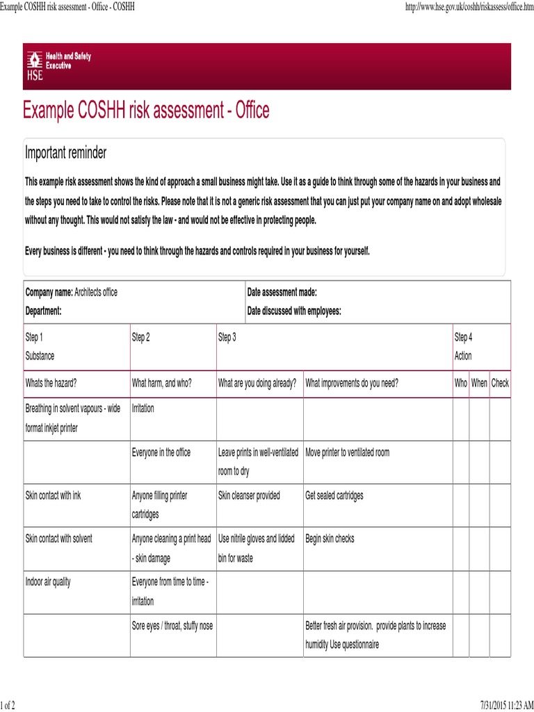 Example COSHH Risk Assessment - Office - COSHH | PDF