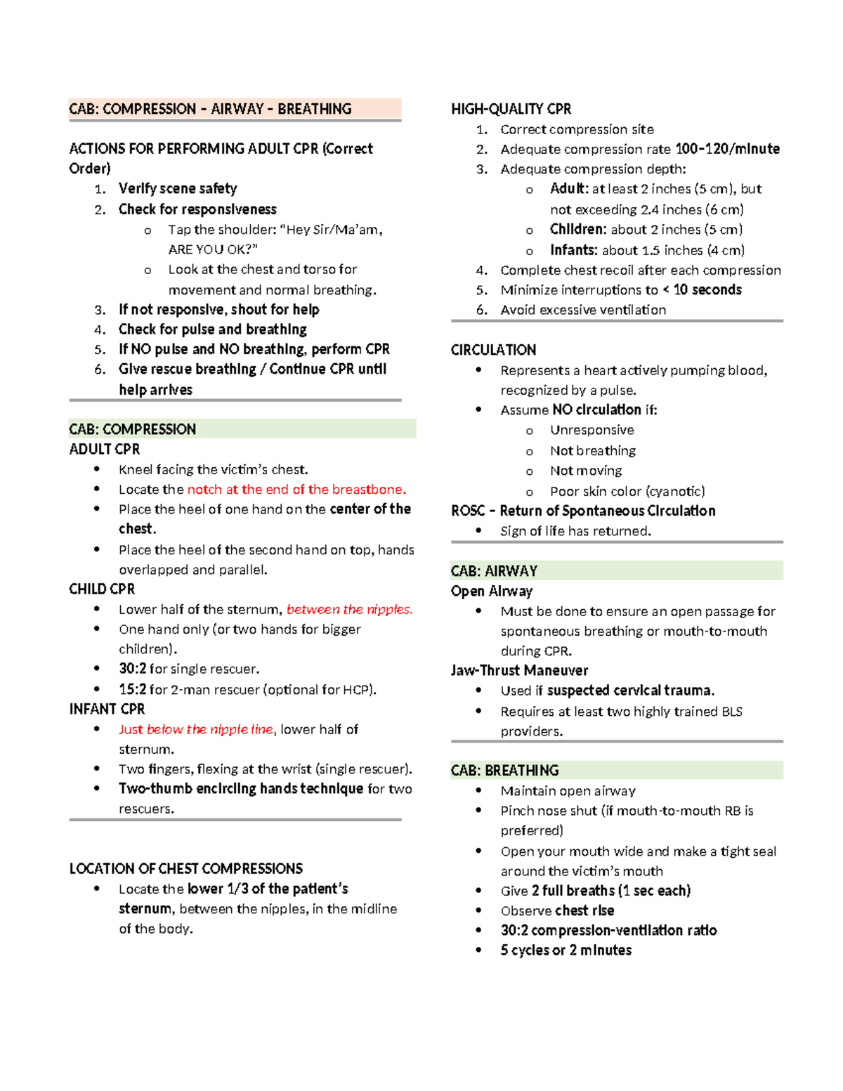 CPR Notes - CAB: Adult, Child, and Infant Techniques - Studocu