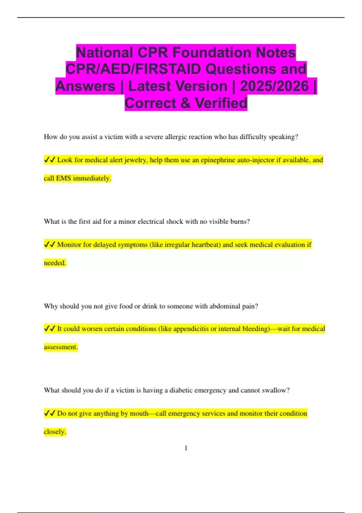 National CPR Foundation Notes CPR/AED/FIRSTAID Questions and Answers ...