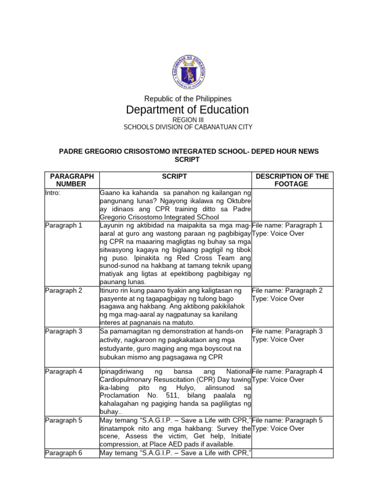 Script-DepEd-Hour-CPR TRAINING-NATIONAL CPR DAY | PDF