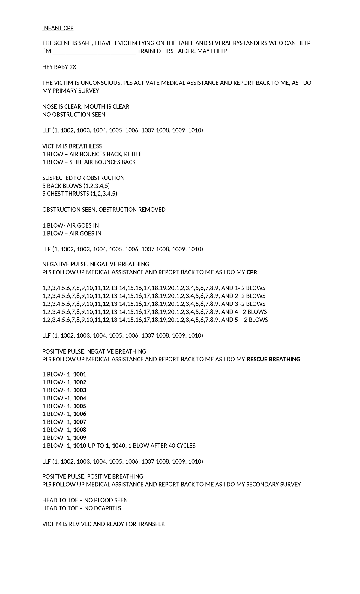 CPR- Script-1 - Cpr - INFANT CPR THE SCENE IS SAFE, I HAVE 1 VICTIM ...