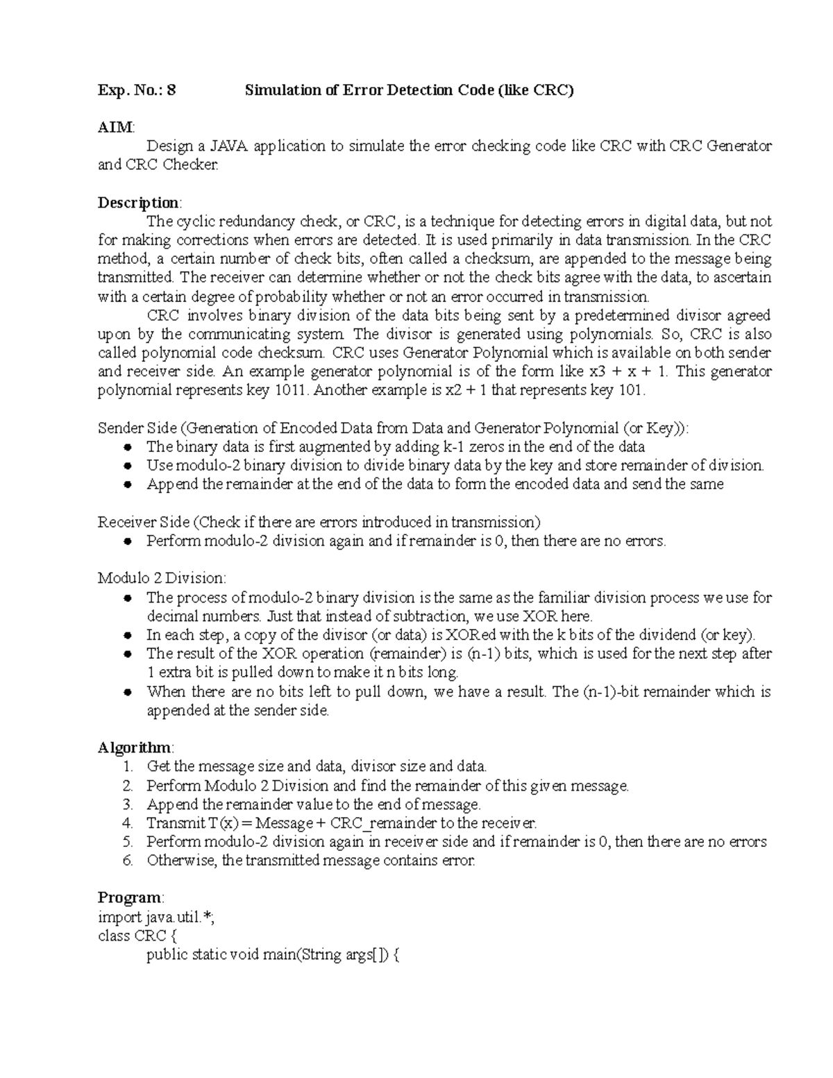 8. JAVA Simulation of Error Detection Code (CRC) Method - Studocu