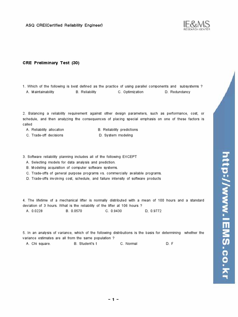 CRE Preliminary Test (30) : ASQ CRE (Certified Reliability Engineer ...