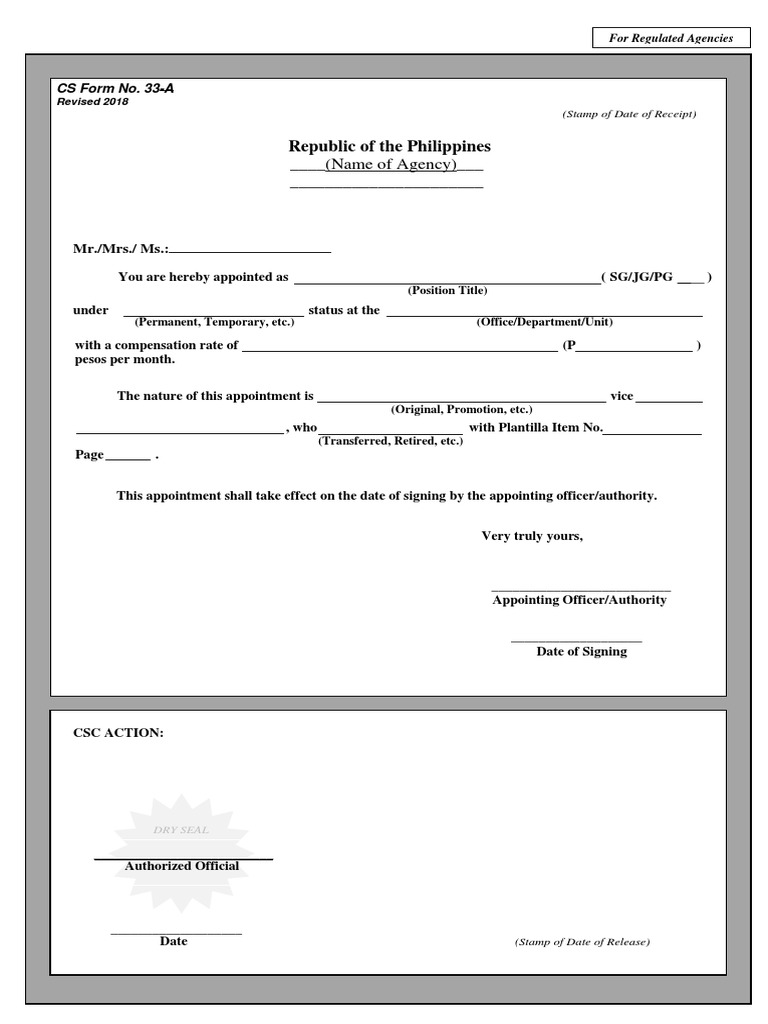 CS Form No. 33-A Revised 2018 Appointment Form - Regulated - CS Form No ...
