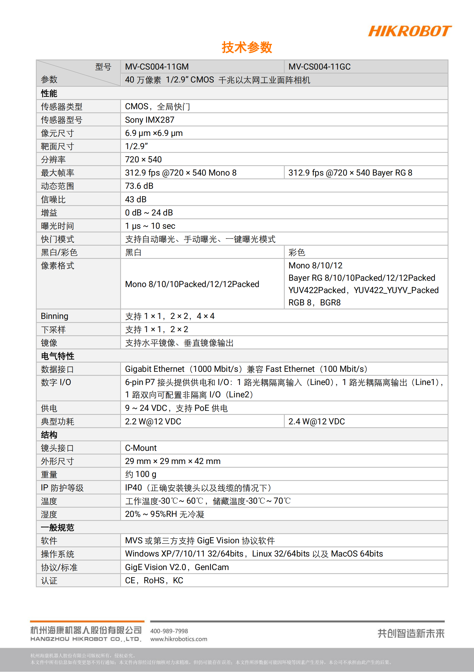 海康40万像素视觉工业网口相机MV-CS004-10GM/GC 1/2.9全局相机-阿里巴巴