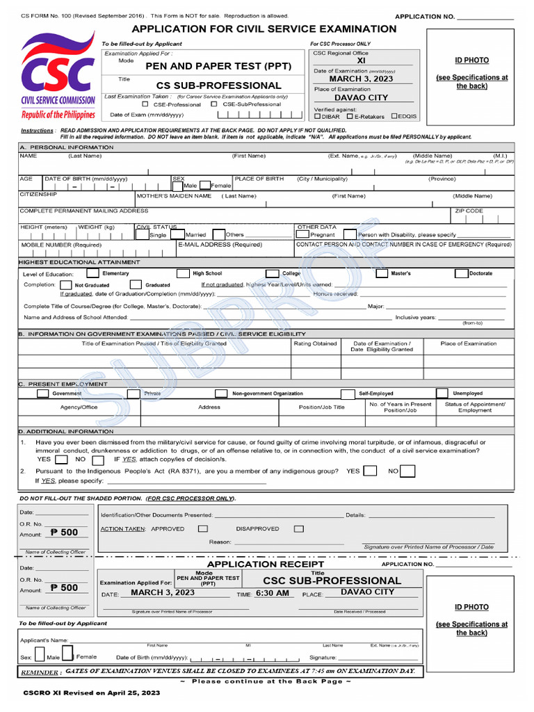 CSC Application Form SUB PROFESSIONAL - Davao City | PDF | Identity ...