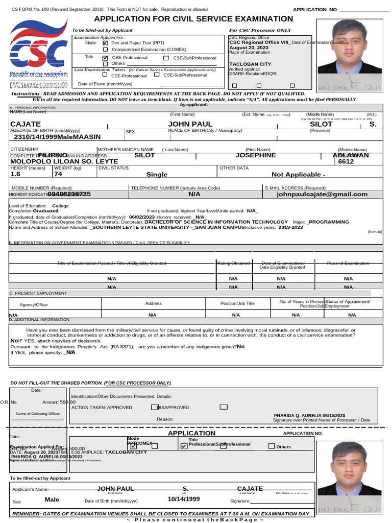 Civil Service Exam Application Form | PDF | Identity Document | Government