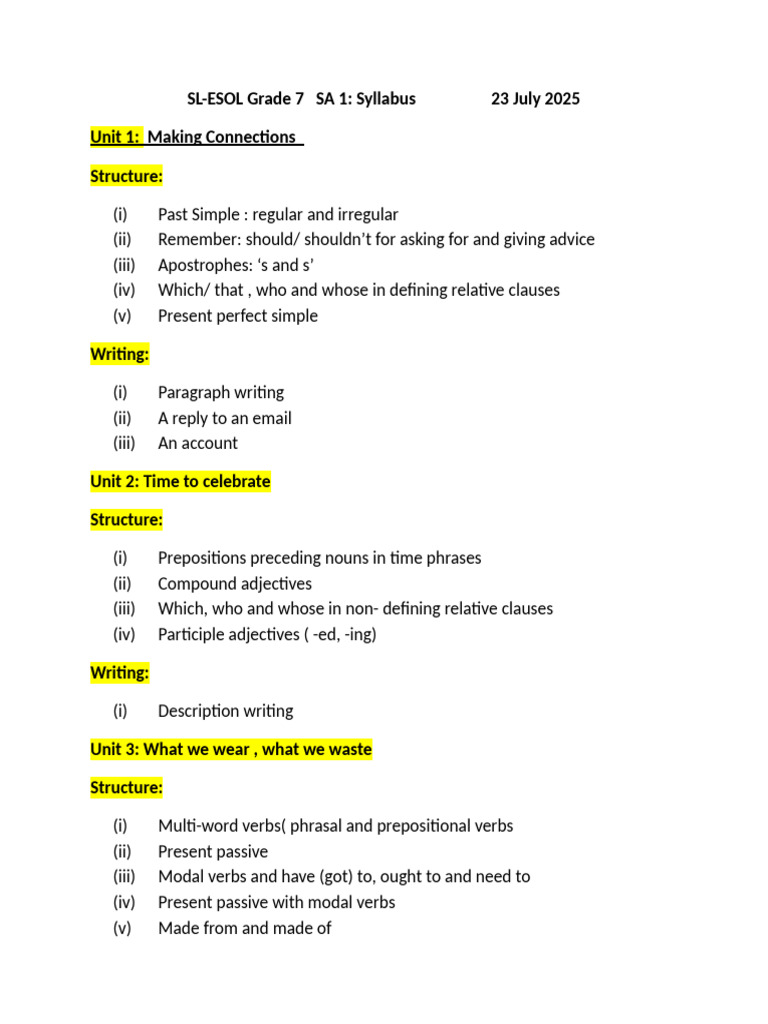 Grade 7 SA - 1 Syllabus | PDF