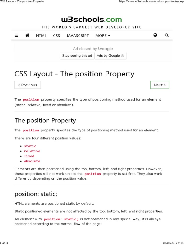 W3schools: CSS Layout - The Position Property | Download Free PDF ...