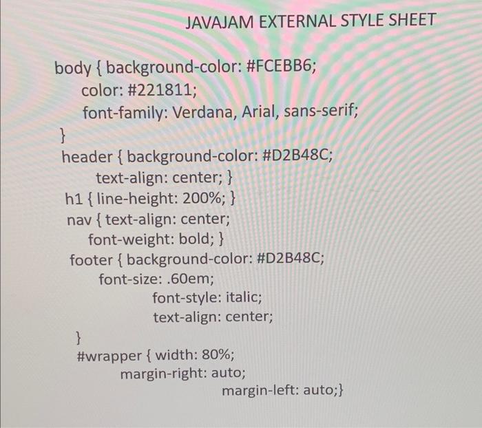 Solved JAVAJAM EXTERNAL STYLE SHEET body \{ | Chegg.com