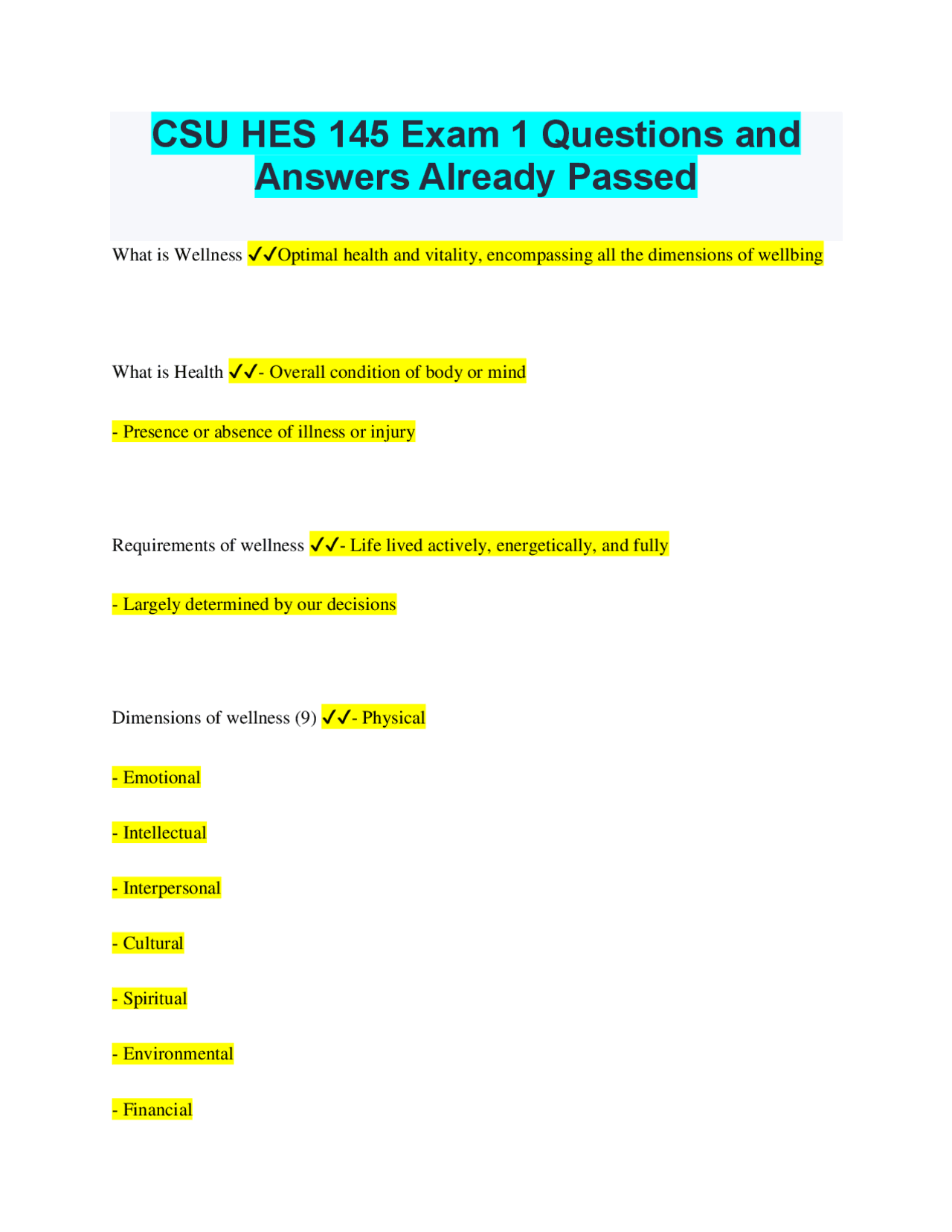 CSU HES 145 Exam 1 Questions and Answers Already Passed | Exams Health ...