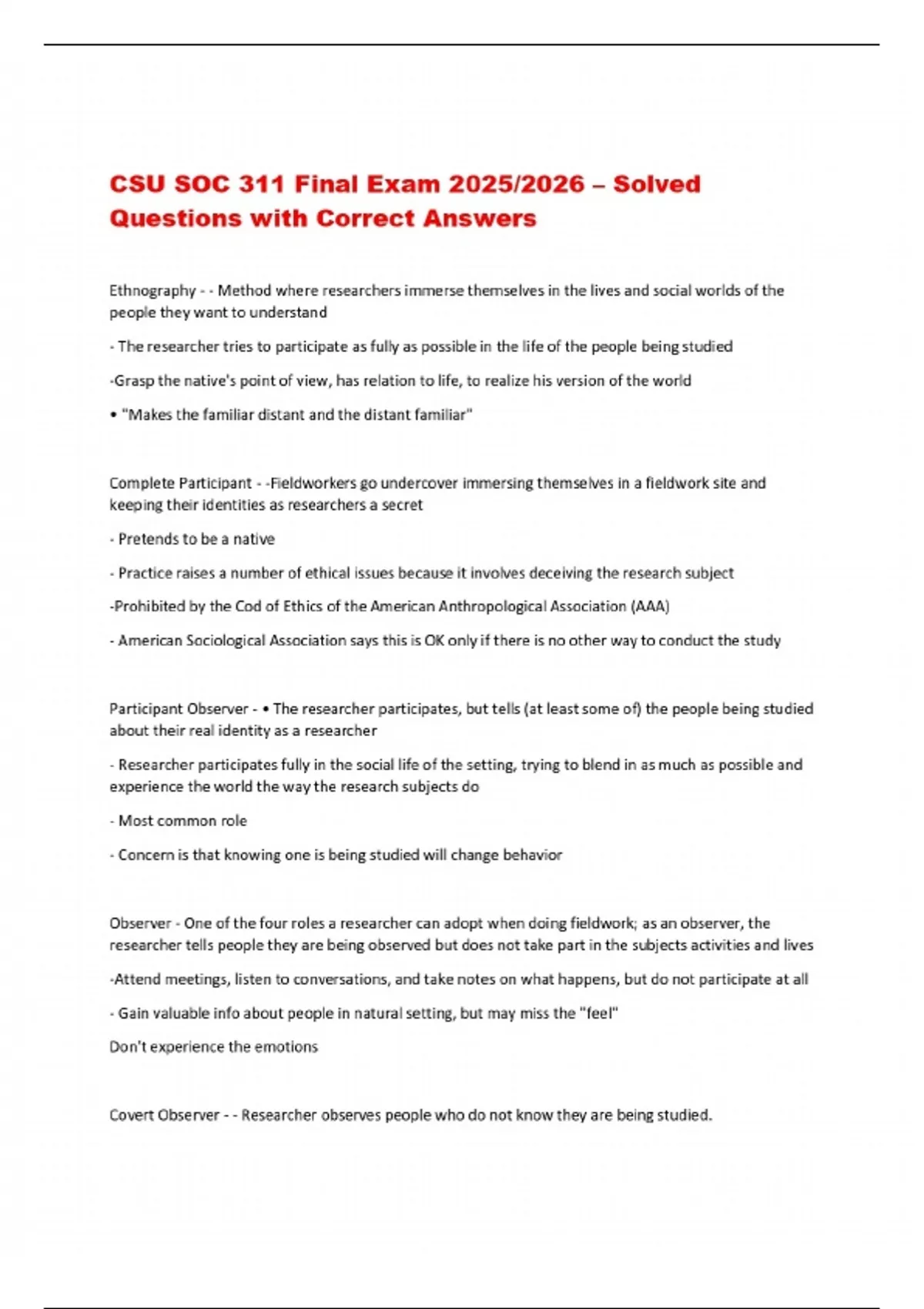 CSU SOC 311 Final Exam 2025/2026 – Solved Questions with Correct ...