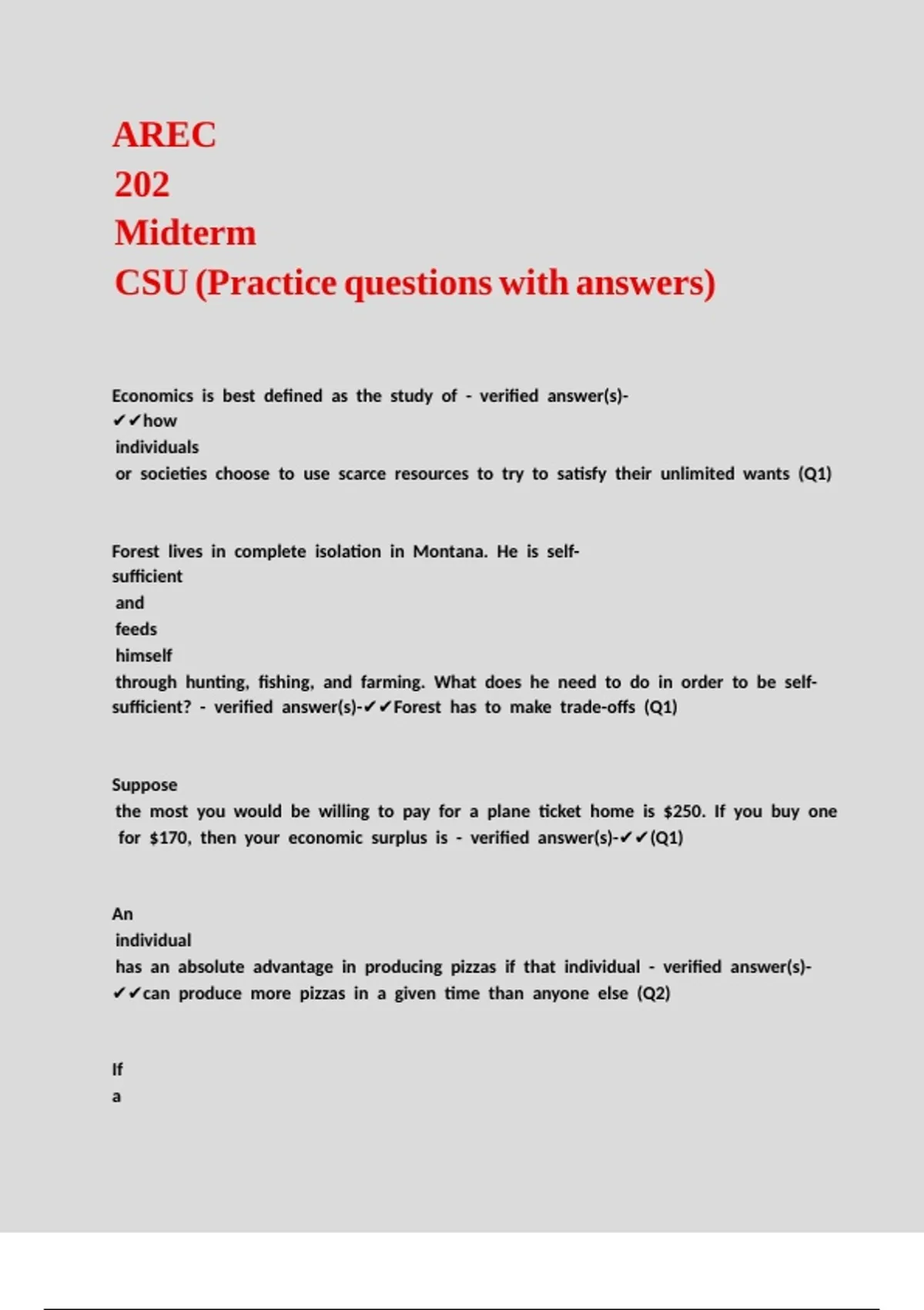 AREC 202 Midterm CSU (Practice questions with answers). - AREC 202 ...