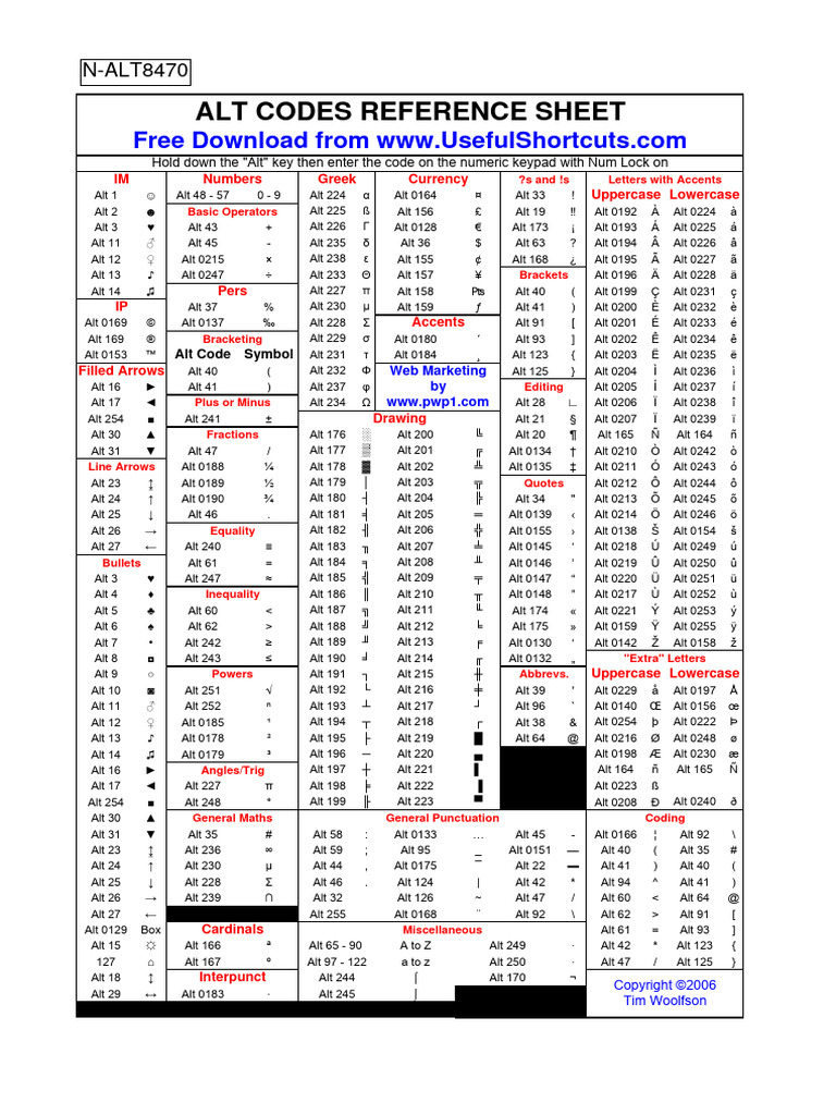100 Amazing Computer Tips: Tip 105 - Alt Code Reference Sheet