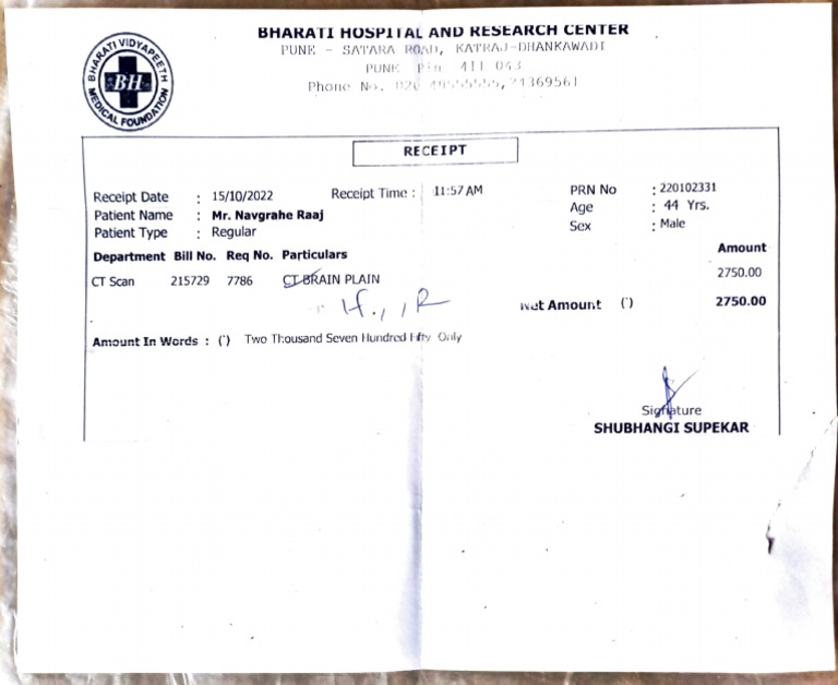 Bharati Hospital CT Scan Receipt | PDF