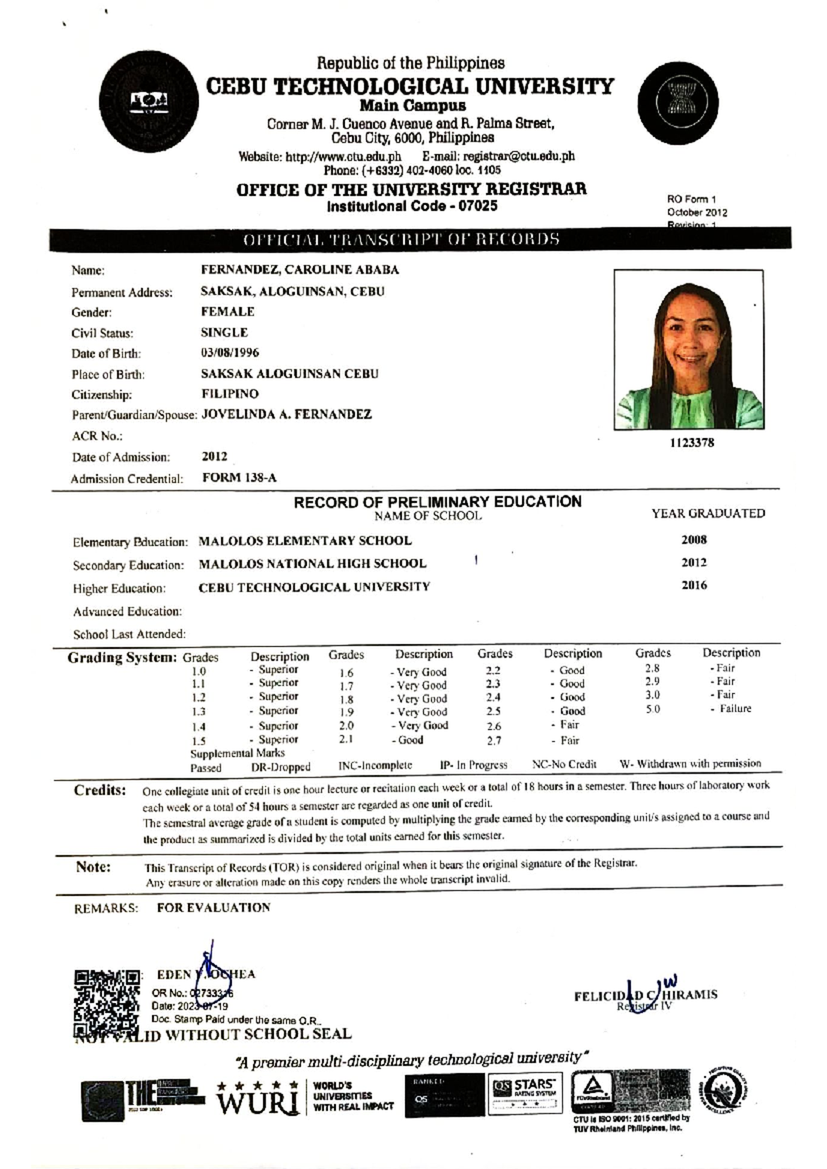 Official Transcript of Records for Caroline Fernandez - CTU 2016 - Studocu