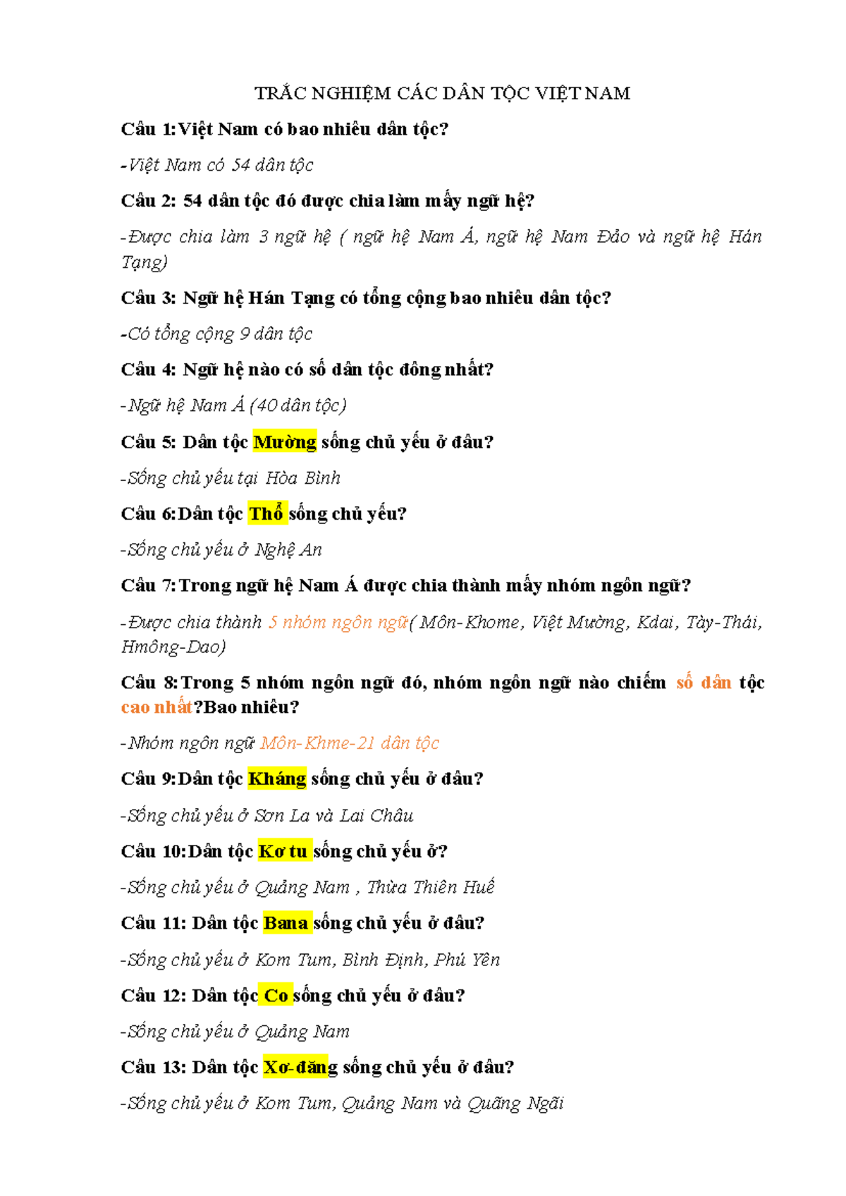 TRẮC NGHIỆM VỀ CÁC DÂN TỘC VIỆT NAM - TỔNG HỢP KIẾN THỨC - Studocu