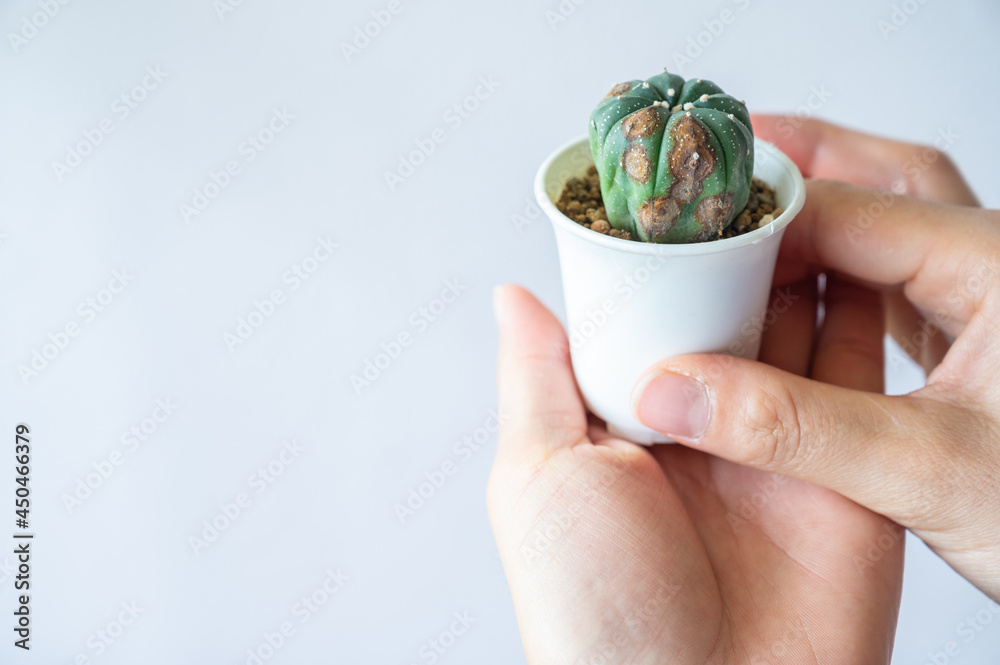 Woman holding Astrophytum cactus with rust disease caused by pathogenic ...