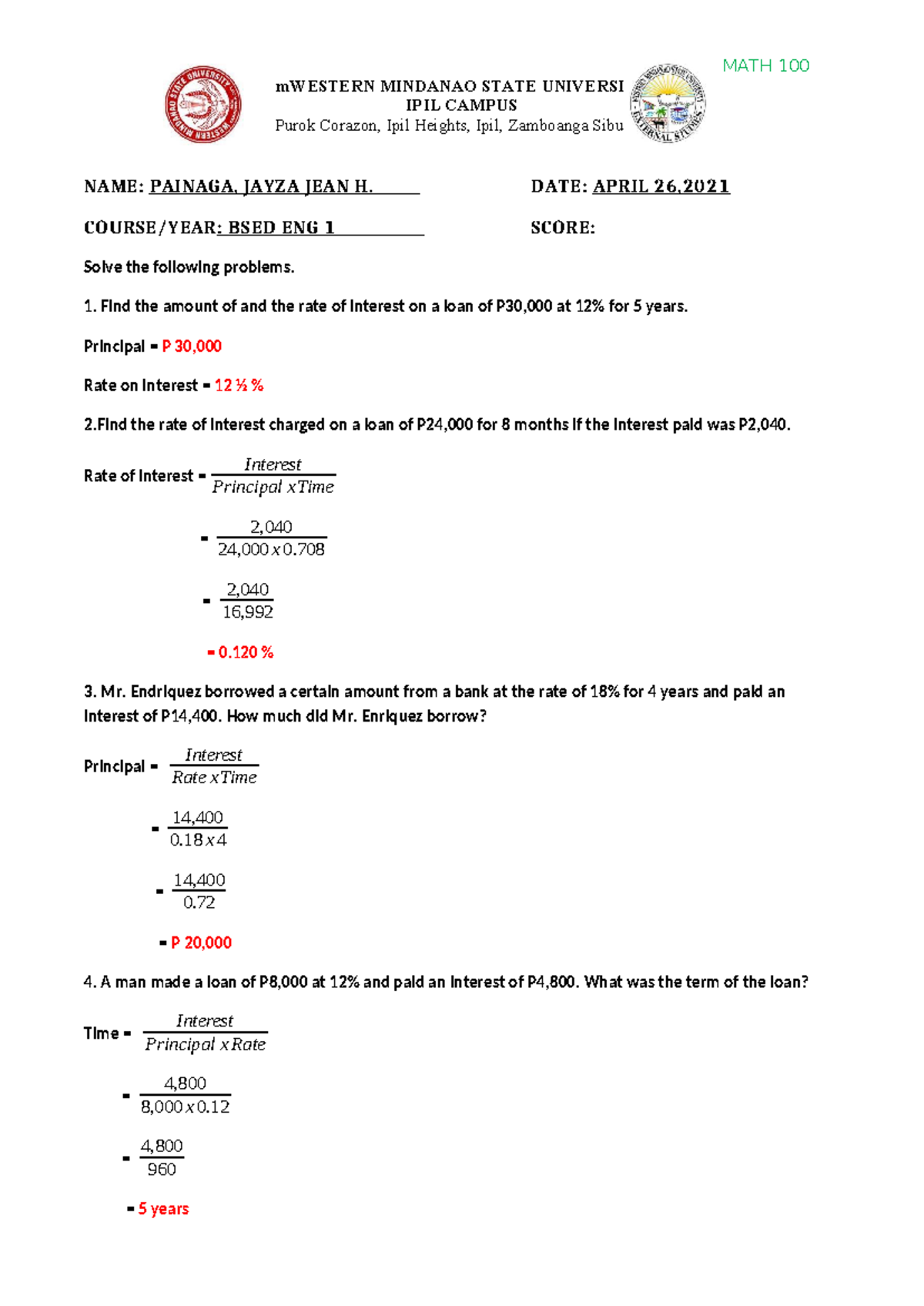 MATH 100 - Interest Calculation Problems and Solutions - Studocu
