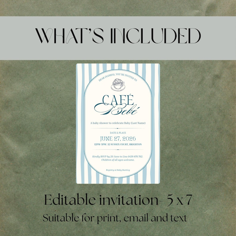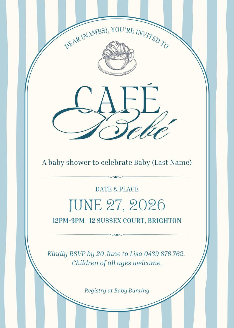 Cafe Bebe Baby Shower Invitation Template Editable, Blue Stripe Coffee ...