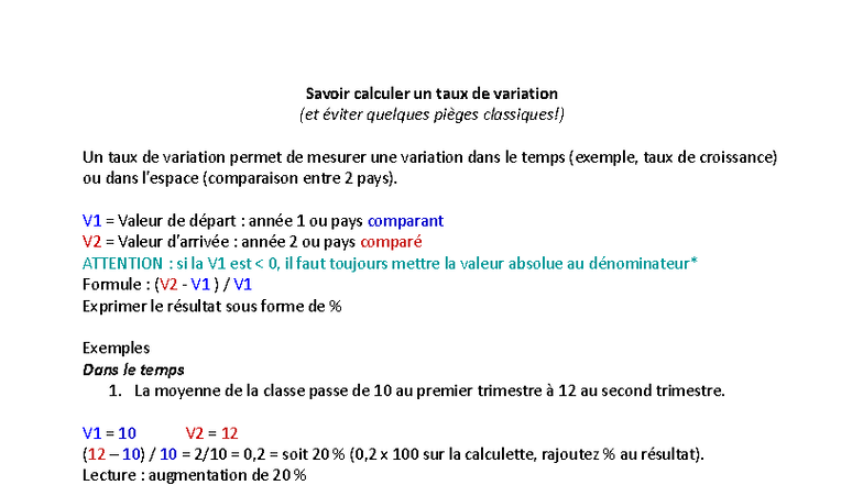 Fiche Méthode: Calcul du Taux de Variation et Éviter les Pièges - Studocu