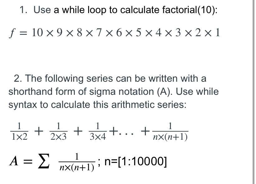 Solved 1. Use a while loop to calculate factorial(10): f 10 | Chegg.com