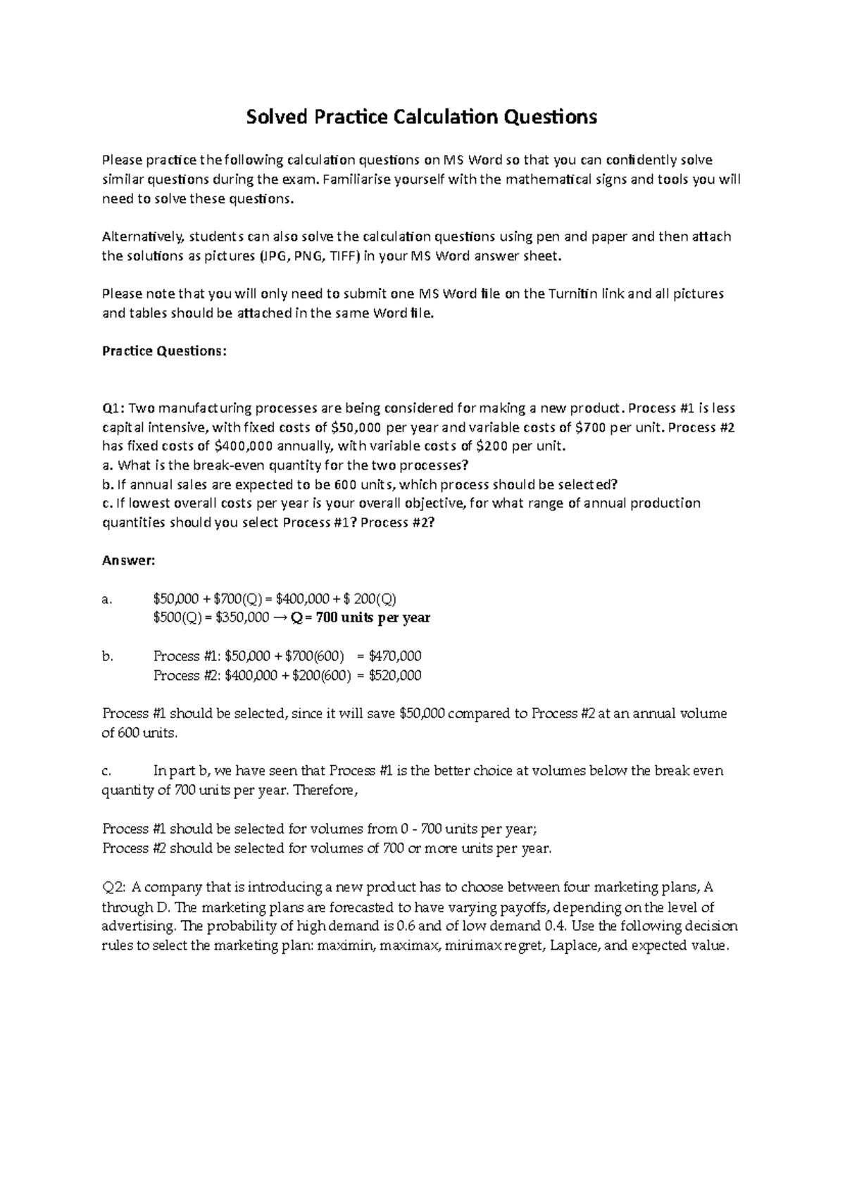 Teacher Solution - Solved Practice Calculation Questions Please ...
