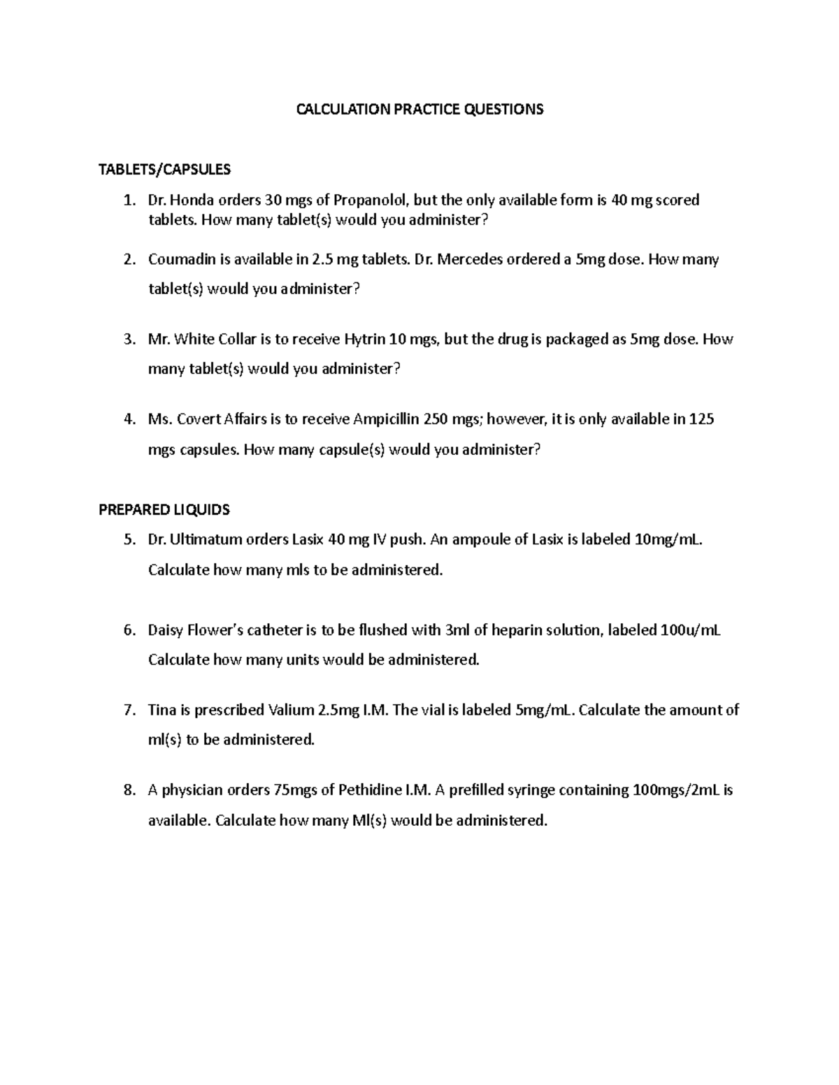 Calculation Practice Questions - CALCULATION PRACTICE QUESTIONS TABLETS ...
