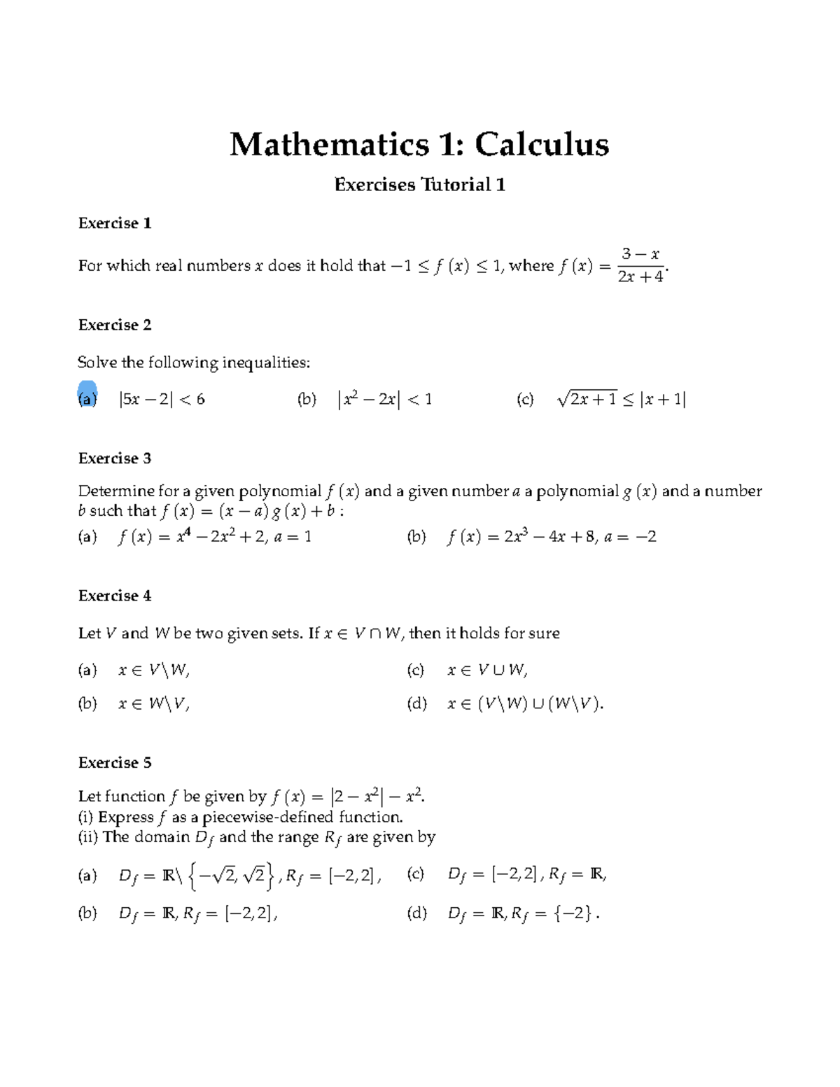 Mathematics 1: Calculus Tutorial 1 Exercises 2025-2026 - Studeersnel