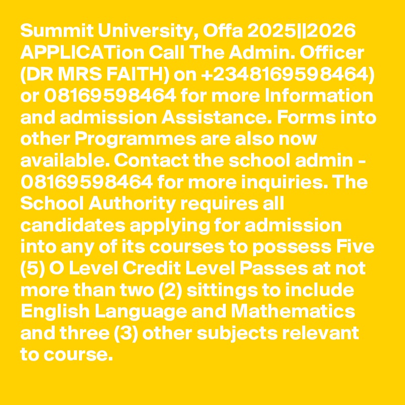Summit University, Offa 2025||2026 APPLICATion Call The Admin. Officer ...