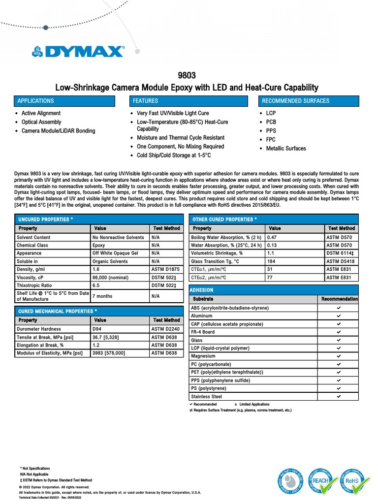 9803 Low-Shrinkage Camera Module Epoxy With LED and Heat-Cure ...