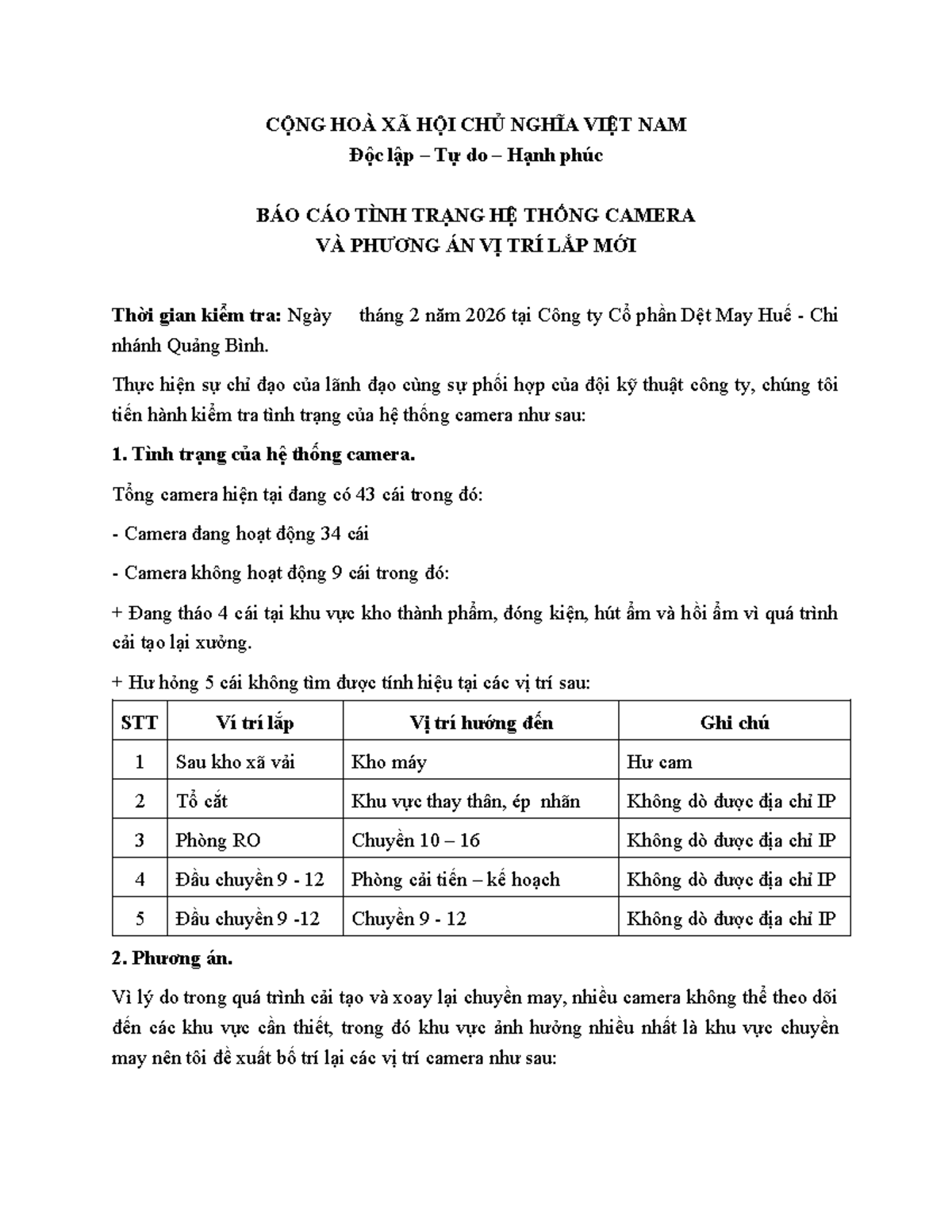 Báo cáo Tình Trạng Hệ Thống Camera và Phương Án Lắp Mới - Studocu