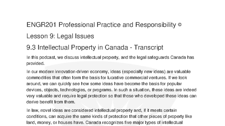 ENGR201 Lesson 9.3: Intellectual Property Legal Issues in Canada ...
