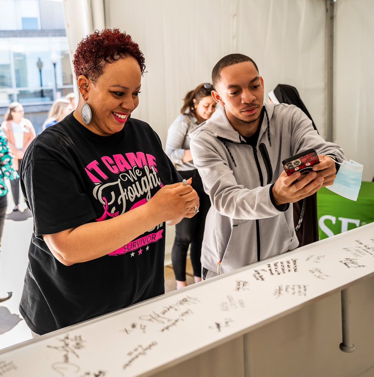 Volunteer Greeting Breast Cancer Survivors Signing Up For Charity Race ...