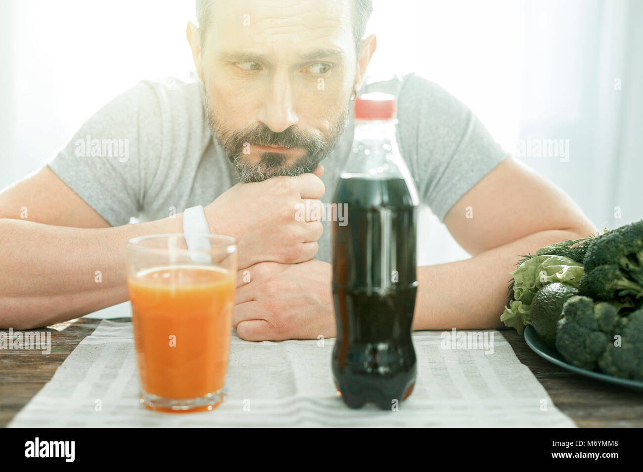 Deep confusing man sitting and looking at cola Stock Photo - Alamy