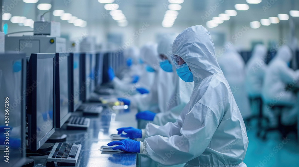Operator in white clean suit, a cap and a mask at an electronic ...