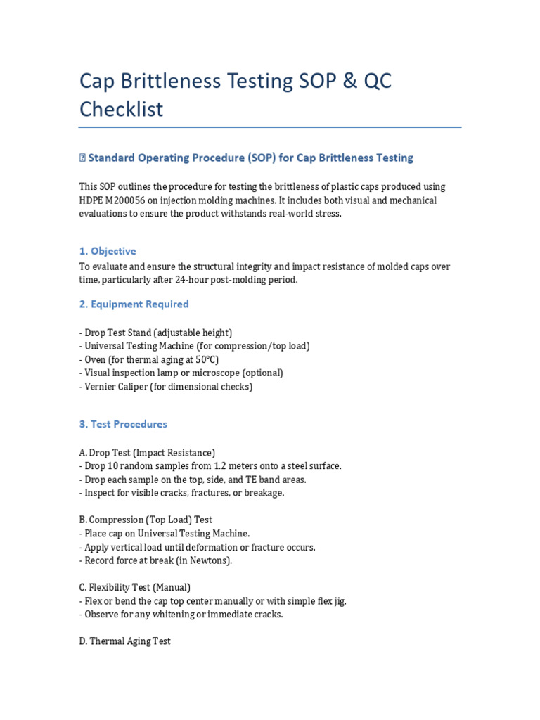 Cap Brittleness Testing SOP and QC Checklist | PDF