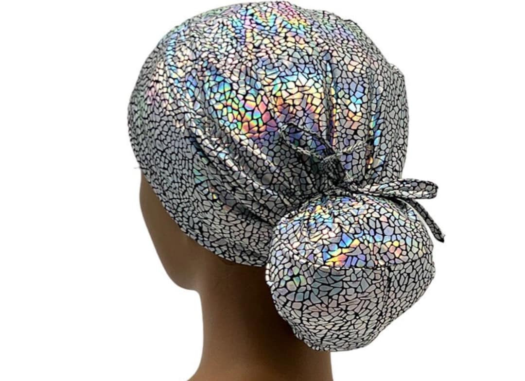 STRETCH Ponytail Scrub Cap,ava Foil Tie Dye Oil Slick Scrub Cap for ...