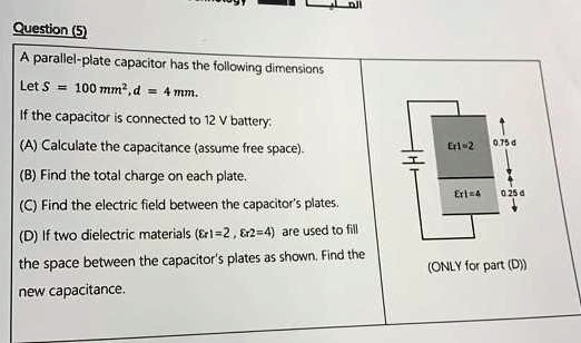 Question (5) A parallel-plate capacitor has the following dimensions ...