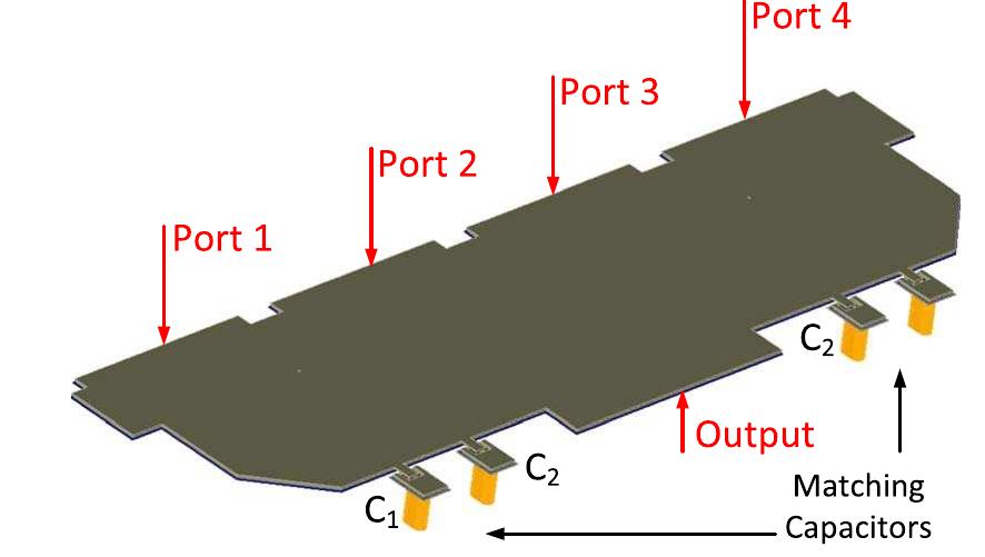 The 4:1 power combiner with matching capacitors. fig. 1.