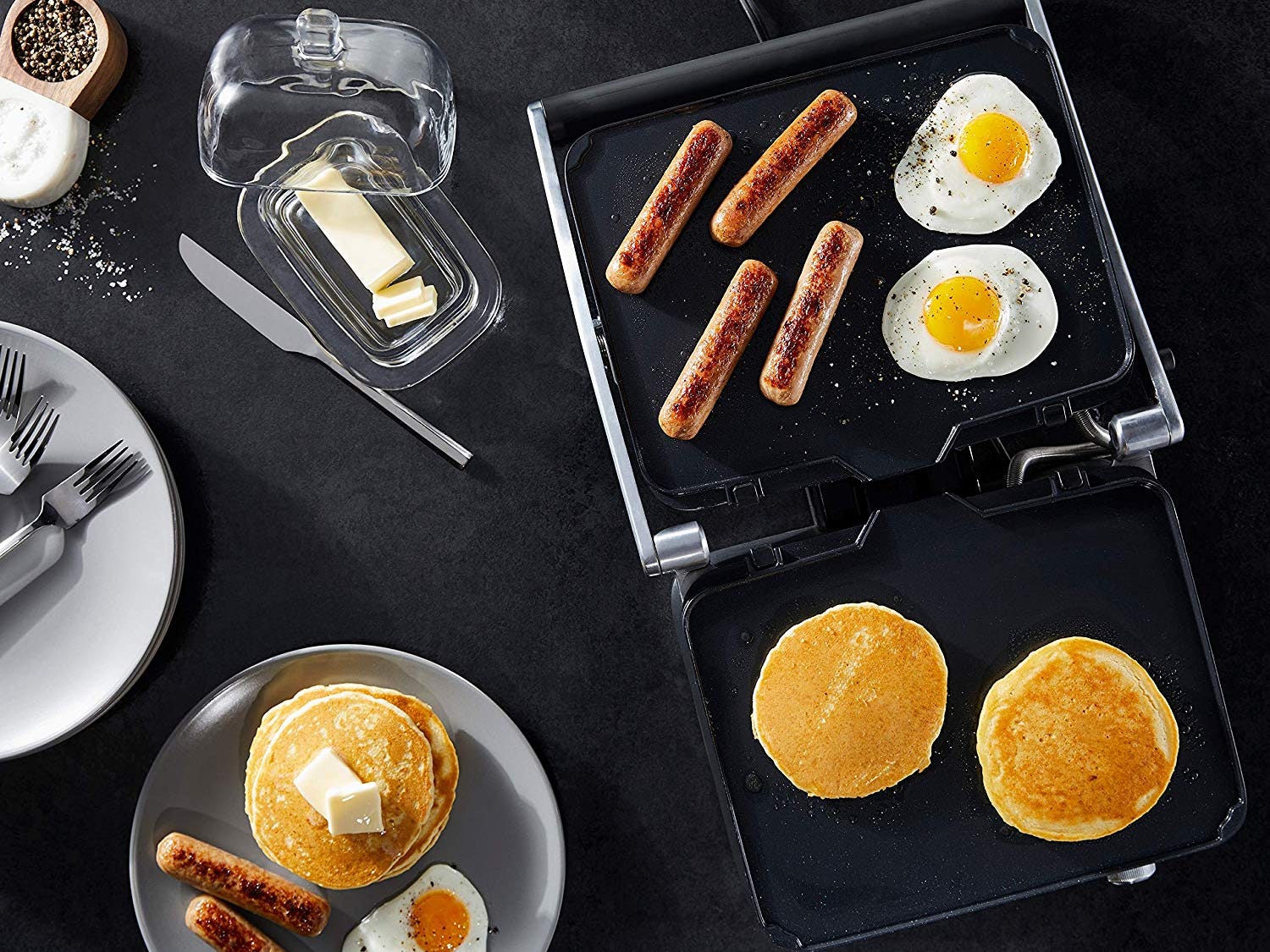 This multi-use electric grill cooks pancakes, steaks, and just about ...