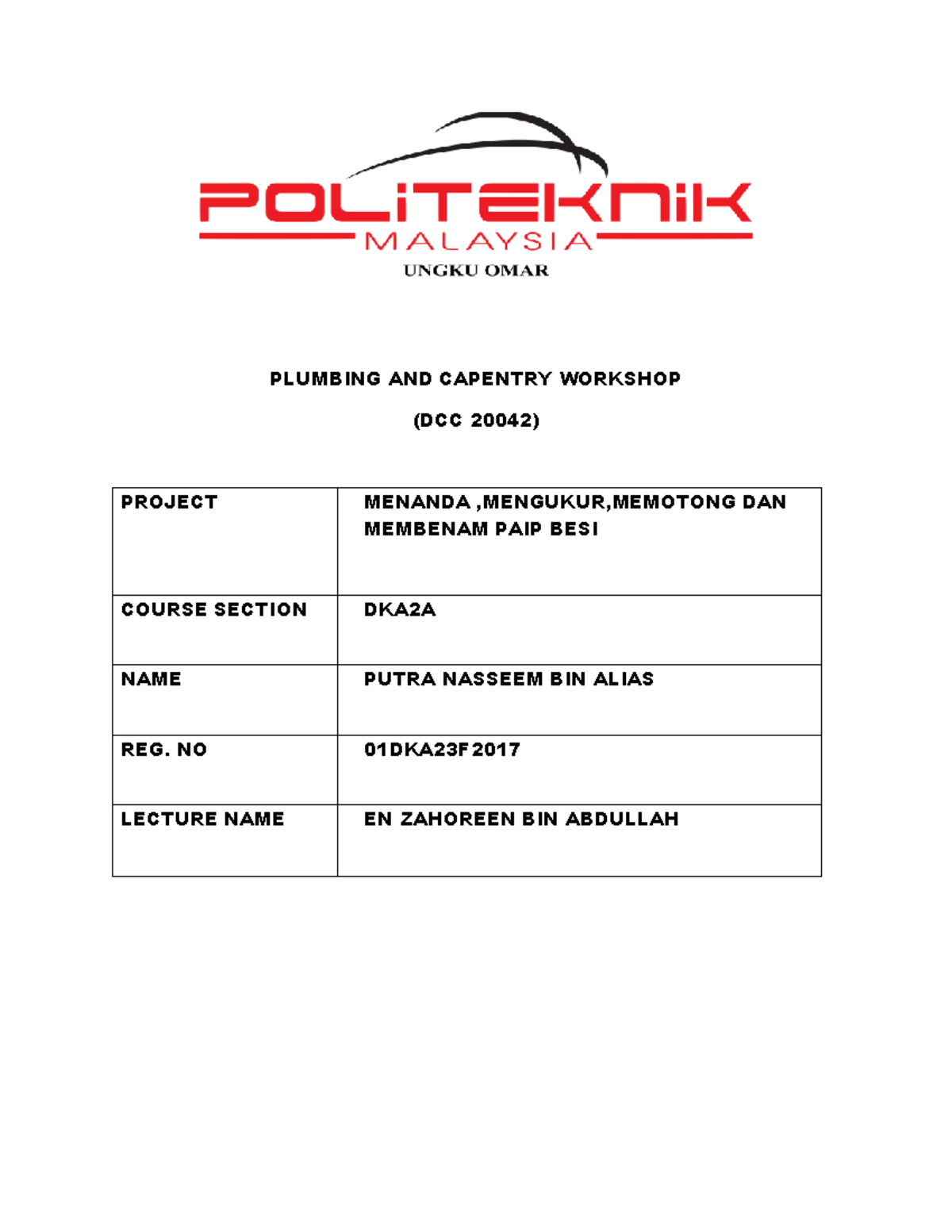 Plumbing Putra DKA2A - nota - PLUMBING AND CAPENTRY WORKSHOP (DCC 20042 ...