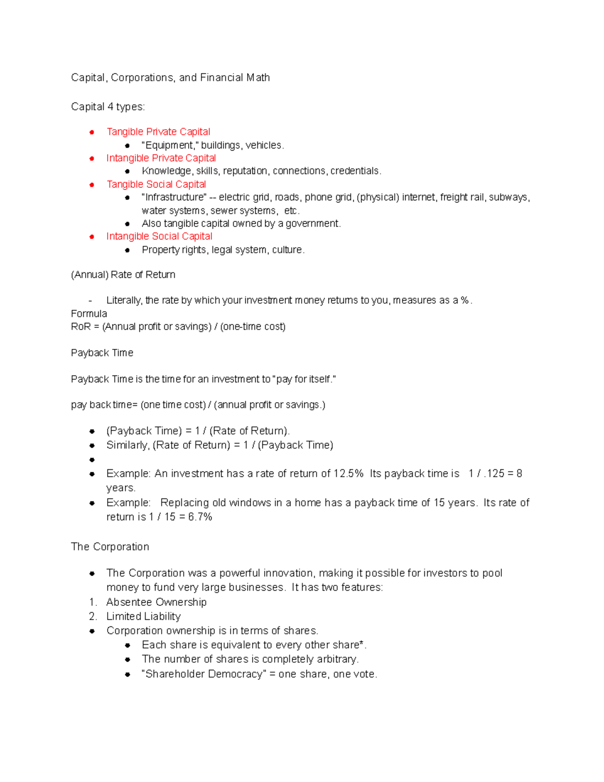 Economics Lesson 6 - Capital, Corporations, and Financial Math Capital ...